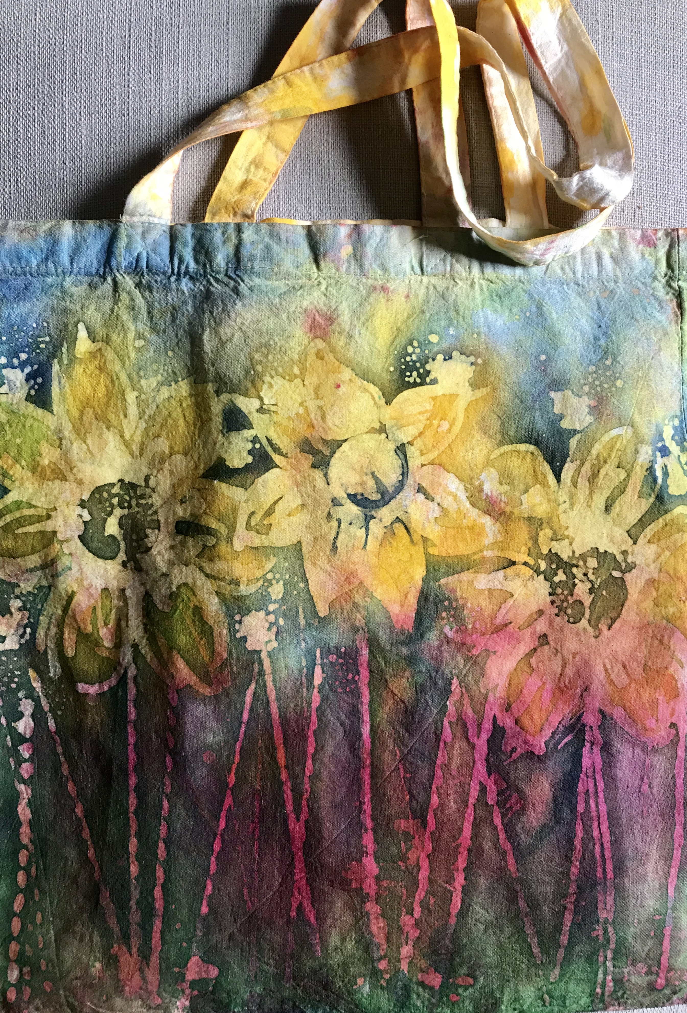 Create a unique bag using batik – hot wax resist and dyes. Landscapes, flowers, birds, abstract designs, it’s possible to have a different design on each side.